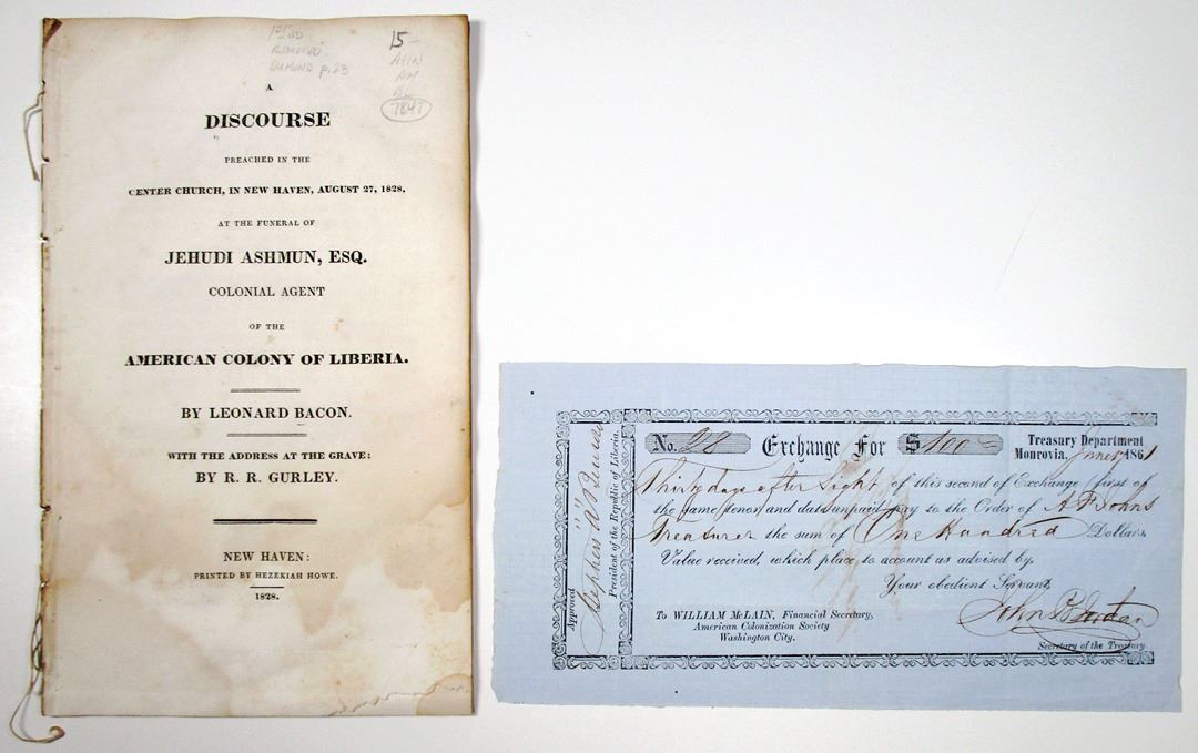 Monrovia, Liberia. Lot of 2 pieces, Includes: A Discourse Preached in the Center Church, in New Haven, August 27, 1828, at the funeral of Jehudi Ashmun, Esq. Colonial Agent of the American Colony of Liberia by Leonard Bacon, 35 pages long with black text, and once was bound by string, printed by Hezekiah Howe in 1828, Fine-VF condition with some staining and damage to binding; and an 1861, Monrovia (Liberia), Treasury Department Second Exchange document, S/N 28, to William McLain, Financial Secretary of the American Colonization Society, for $100, Black text on blue paper, VF to XF condition. Signed by Stephen A Benson, the Second President of Liberia and this document is issued in 1861, the year before the U.S. recognized Liberia as a country. Stephen Allen Benson served as the 2nd President of Liberia from 1856 to 1864. Prior to that, he served as the 3rd Vice President of Liberia from 1854 to 1856 under President Joseph Jenkins Roberts. Although born in the United States, Benson was the first president to have lived in Liberia since childhood, he and his family having arrived with the first groups of settlers in 1822. Jehudi Ashmun (April 21, 1794 - August 25, 1828) was an American religious leader and social reformer from New England who became involved in the American Colonization Society. It founded the colony of Liberia in West Africa as a place to resettle free people of color from the United States. Ashmun emigrated to Monrovia, Liberia in 1822, where he served as the United States government's agent (de facto governor) for two different terms. American Colonization Society (ACS), originally known as the Society for the Colonization of Free People of Color of America, was founded in 1816 by Robert Finley to encourage and support the migration of free African Americans to the continent of Africa. The African-American community and abolitionist movement overwhelmingly opposed the project. In most cases, African Americans' families had lived in the United States for generations, and their prevailing sentiment was that they were no more African than white Americans were European. Contrary to stated claims that emigration was voluntary, many African Americans, both free and enslaved, were pressured into emigrating. Indeed, enslavers sometimes manumitted their slaves on condition that the freedmen leave the country immediately. Fascinating pair of items related to a controversial society in American history. (2)