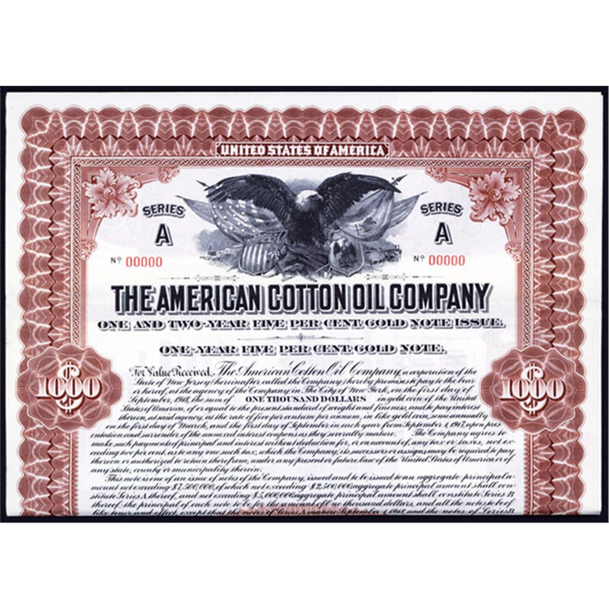 New Jersey, 1917, $1000, Ser.A, 5% Gold Note Issue, Black on brown border and underprint, Eagle with U.S and Mexican shields and flags on top, Specimen overprint, POC's, coupons attached, Franklin Lee Division - ABNC. American Cotton Oil Company, a predecessor of Bestfoods, now part of Unilever. The company was part of the 12 original Dow Average companies. In the early 1880s mill owners in Texas and Arkansas formed syndicates to regulate the price paid for seed and so moderate competition. About 1884 these syndicates combined to form the American Cotton Oil Trust. By the fall of 1886 this group controlled 88 percent of the crushing capacity of the country. In 1888 Louisiana sued to have the trust dissolved, and in 1889 it was reorganized as a corporation, the American Cotton Oil Company