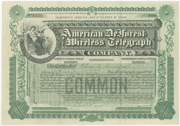 Maine. 1904. I/U. 5 Shares. Green border and under print, Allegorical topless woman with cherub on left with large ornate title. VF-XF. Rare and lovely telegraph certificate. NYBNC.
