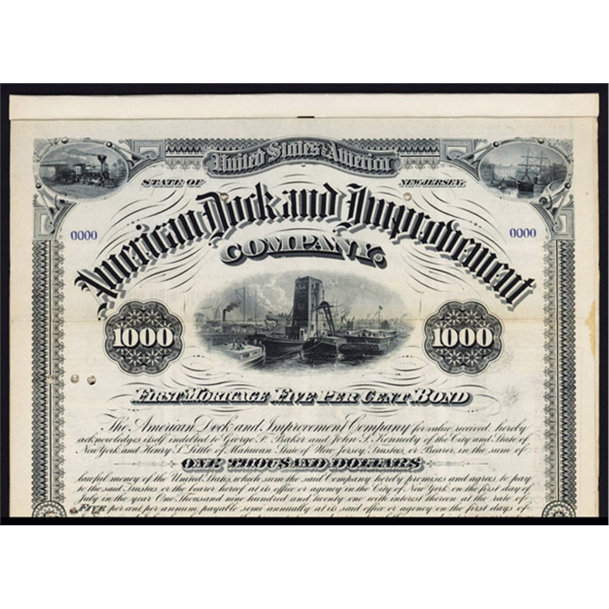 New Jersey, 1881, $1000, First Mortgage 5% Bond, Specimen, Black on violet border and underprint, Canal scene top center with moving train on upper left and docked ship on upper right, Coupons attached, VF-XF condition, ABNC.