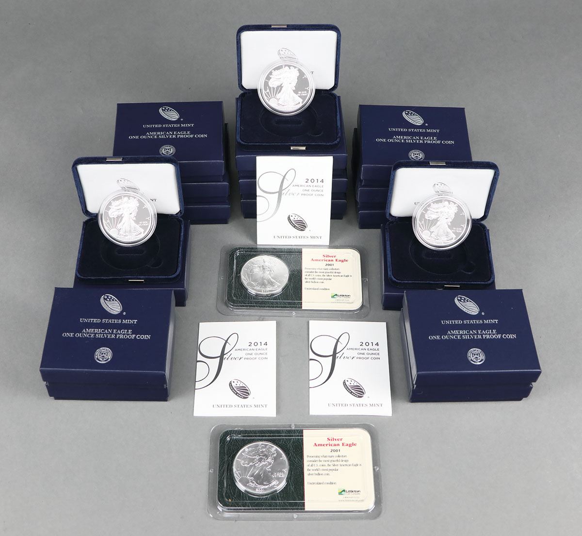 lot of 17 proof and uncirculated American Eagle 1 ounce silver coins; includes 15 proof examples of 2014 eagles and two uncirculated 2001 coins. (17 ounces of silver). Shipping charges apply - weight 5 lbs. (photo on web site)