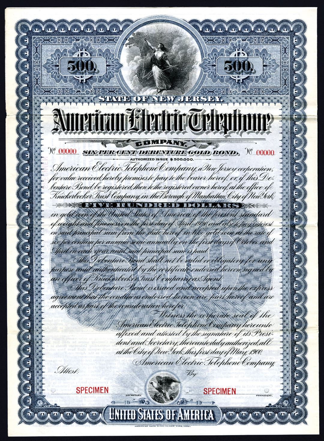 New Jersey, 1900, $500, 6% Debenture Gold Bond, Specimen Bond, VF-XF condition, ABNC. Early upright telephone manufacturer established in 1894. Rare and historic telephone manufacturer bond.