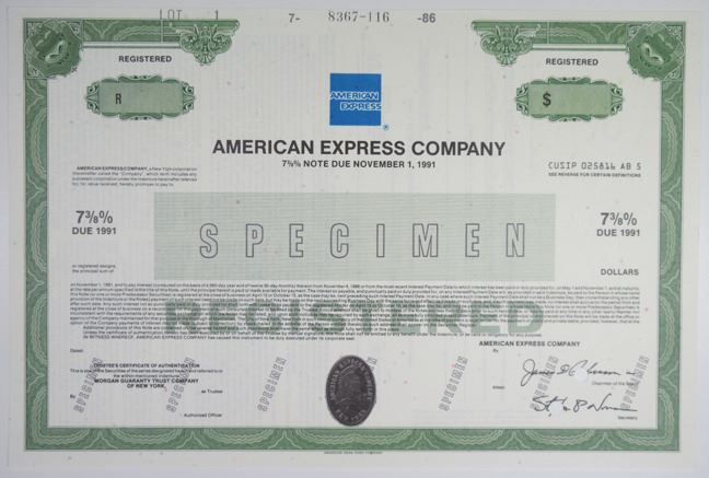 New York, 1986. Specimen $Odd Specimen 7 3/8% Registered Bond, Black text with green border and underprint, American Express logo at top center. Specimen overprint, POCS, VF-XF condition, ABNC. The American Express Company is an American multinational financial services corporation headquartered at 200 Vesey Street in New York City. The company was founded in 1850 and is one of the 30 components of the Dow Jones Industrial Average.