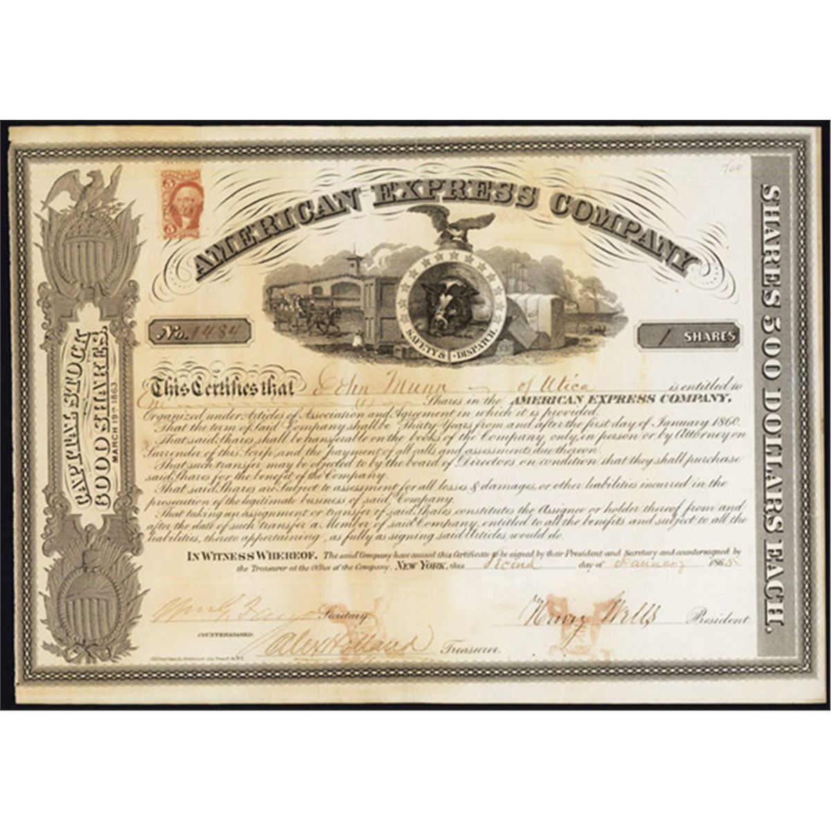 New York, NY, 1865, 1 Shares, Issued and uncancelled but transferred, Black with no underprint, Capital Stock 6,000 Shares, Unlisted Type, Henry Wells, William Fargo and Holland autographs, bulldog facing left with small eagle on top flanked b train station with train on left and steamship with wharf scene on right, Fine to VF condition with light toning and foxing, Scarce unlisted earlier Stock Capitalization variety.