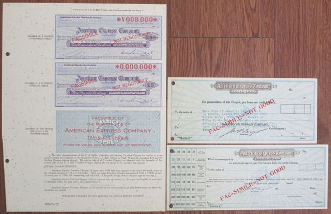 Ca. 1919-1946. Lot includes 3 pieces: A page from a 1946 American Express Travelers Cheque document, highlighting the special characteristics of travelers cheques, with denominations and watermarks, double-sided; Facsimile of an American Express Cheque 1919 Series E, Black text with blue background and typed conditions; Facsimile American Express Limited Cheque 1920 Series B, Black text with blue background. All have Facsimile overprints in red. Fine-VF condition. The American Express Company is a multinational financial services corporation