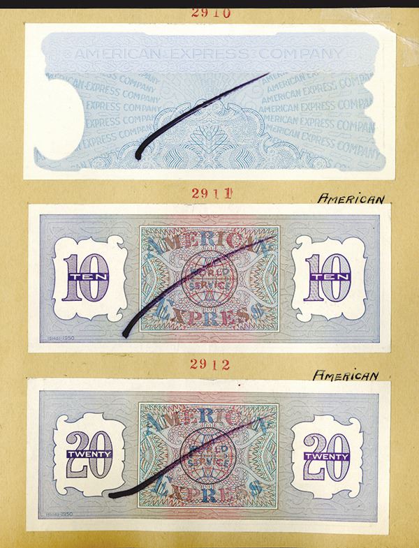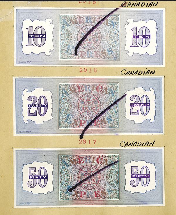 U.S. & Canada. 10, 20 and 50 Dollars. 1950 in lower left corner. One partially printed face and 2 backs marked "American" (US use?), and 10, 20, 50 Dollars, marked "Canadian" (Canadian use?) Uniface proofs mounted on both sides of a card page. As made, but with marker cancelation diagonally thru center of each. 6 notes on one page.
