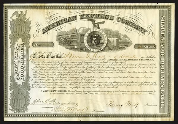 New York, NY, 2 Shares, I/U stock certificate. Capital Stock 6,000 Shares at $500 each, Black border with locomotive left to right underneath curved title, Signatures of William Fargo, Alex Holland and Henry Wells as president. VF-XF condition. S/N 3484, Rare early type and historic stock certificate. Printer: John H. Duyckinck.