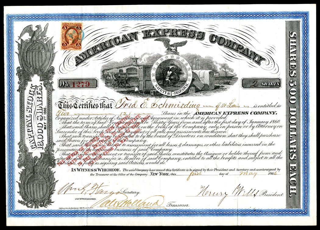 New York, NY, 1866. 2 Shares, I/U stock certificate. Capital Stock 18,000 Shares at $500 each, Blue border with no undertint, vignette of sad dog (Safety & Dispatch) underneath curved title, Signatures of William Fargo, Holland and Henry Wells as president. VF condition. Scarce and historic stock certificate. Printer: John H. Duyckinck.