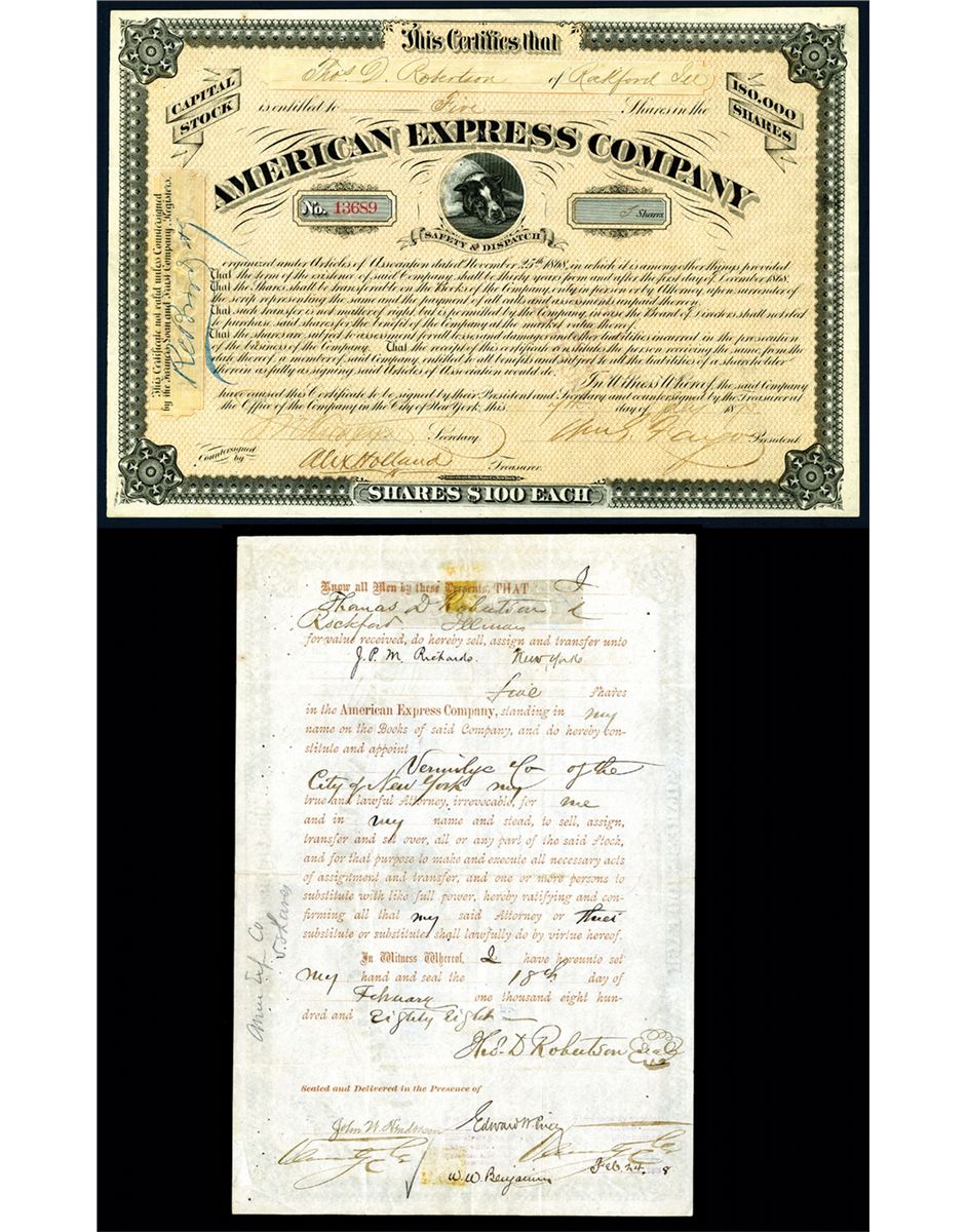 New York, NY, 1873. 5 Shares, I/C stock certificate. Capital Stock 180,000 Shares at $100 each, Black border with light orange-brown undertint, sad dog (Safety & Dispatch) underneath curved title facing right, Signatures of William Fargo as president. VF condition, Scarce and historic stock certificate. Printer: ABNC.