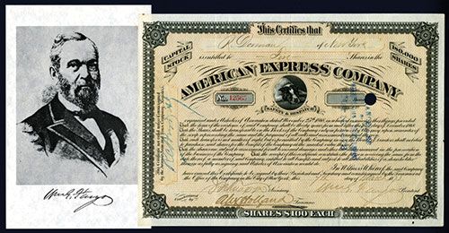 New York, NY, 1873. 5 Shares, Issued and punch cancelled stock certificate. Black border with light orange undertint, vignette of sad dog (Safety & Dispatch) underneath curved title, Signatures of William Fargo, Holland and Flagg. XF condition. ABNC. Scarce and historic stock certificate.