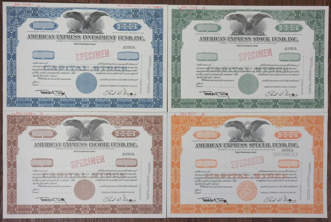 Delaware, 1970. Lot of 4 different American Express Specimen Stock Certificates all with spread winged eagle vignette but different color borders, Includes: A.E. Special Fund, Inc., Orange border; A.E. Income Fund, Inc., Brown border; A.E. Investment Fund, Inc., Blue border; and, A.E. Stock Fund, Inc., Green Border, all have Specimen overprints, POC's, and are in Uncirculated condition. ABNC. 4 Pieces.