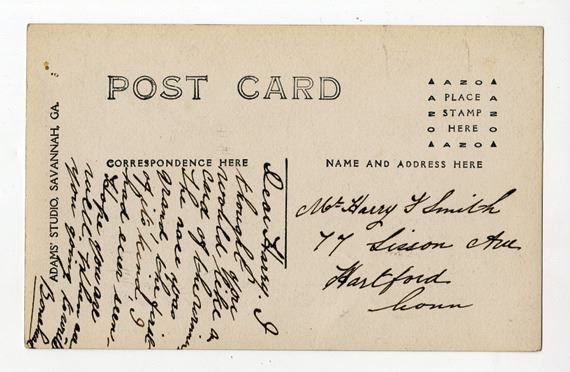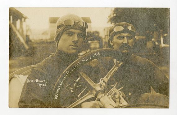 Georgia. 1910, Real Photo Postcard, 5.5 inches x 3.5 inches, The 1910 American Grand Prize was a Grand Prix auto race held on closed public roads outside Savannah, Georgia on November 12, 1910. It was the second edition of the Automobile Club of America's American Grand Prize. The race was won by American, David Bruce-Brown, who was driving a Benz. After a successful race in 1908, the Automobile Club of America made plans with the rival American Automobile Association to hold the Grand Prize and Vanderbilt Cup together on the Long Island Motor Parkway in 1909. However, only the Vanderbilt race was held, and the Grand Prize pushed back to 1910. After the 1910 Vanderbilt Cup, in Long Island, saw the deaths of 2 riding mechanics and several serious spectator injuries, the Grand Price Grand Prix was almost canceled. A shorter 17-mile (27 km) course was laid out, but due to the short notice, many European teams were not able to make the trip; only 6 European cars entered the event, down from 14 two years ago. Ralph DePalma, Bruce-Brown, and HŽmery took over the first three positions, within two minutes of each other. On the penultimate lap, De Palma cracked a cylinder in the last of the Fiats. At the finish, HŽmery crossed the line first due to the staggered start, and as in 1908 was forced to wait for the next car to cross the line. In the end, Bruce-Brown finished just 1.42 seconds faster than HŽmery. Historic and extremely rare real photo postcard showing handsome David Bruce-Brown ("Beas") at the left with his onboard mechanic. Written on the negative (and appearing as white writing on the postcard) is "Winner Grand Prize Auto Race 1910". Bruce-Brown was born on August 13, 1887, the son of George Bruce-Brown and Arabella Loney. He attended the Allen-Stephenson School in New York City, and then the Harstrom School in Norwalk, Connecticut, a prep school for Yale. Having bluffed his way into auto racing at the age of 18, Bruce-Brown turned out to be a natural talent behind the wheel and won the 1908 Daytona Speed Trials. He then went on to win the American Grand Prize in both 1910 and 1911, as well as numerous other races. He also participated in the 1911 and 1912 editions of the Indianapolis 500. Bruce-Brown was killed during practice, along with his mechanic Tony Scudelari, for the 1912 American Grand Prize and 8th running of the Vanderbilt Cup races, which were held in Wauwatosa, Wisconsin, near Milwaukee at the age of 25. The back of the postcard has a handwritten note with a Hartford, CT. address, but was never mailed, hence the excellent condition of the card which has sharp corners, no bends or fold and appears in mint condition. Extremely rare real photo postcard of this historic race, which, though not the first major race in the U.S., it was probably the largest.