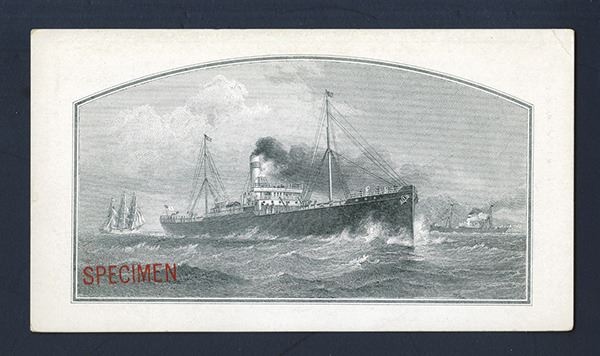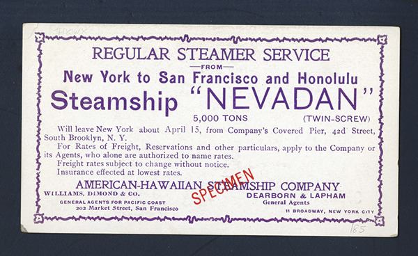 Hawaii. American-Hawaiian Steamship Co. Steamer on face, ad on back for service from New York to San Francisco and Honolulu; leaving from South Brooklyn NY. The ship operated this route from 1902-1916. During the war it changed to Canadian then back to US ownership, renamed the SS Alamance and in 1918 was torpedoed off the north-east coast of Ireland. Measures almost 6 x 3-1/4 inches. Red SPECIMEN overprint on each side. ABNC.