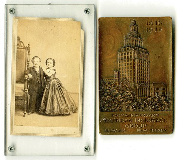 Newark, NJ, Bronze medal, 2 1/2 X 4", 1846-1946, AU. Also included is a General Tom Thumb carte de visite, with a torn corner.