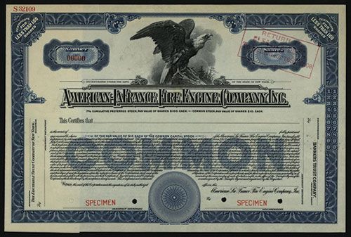 Elmira, New York. 19xx (ca.1900-1920). <100 Shares. Blue border with Vignette of Eagle. Specimen overprints and POC's. At the turn of the century, the LaFrance Fire Engine Company joined with the American Fire Engine Company to become the American LaFrance Fire Engine Company. By 1916, American LaFrance produced a 6-cylinder, gas-powered pumping apparatus that performed so well it literally spelled the end of the steam engine. Famous and rare Fire engine company. ABNC