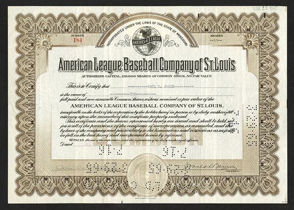 Missouri, 1936, 10 Shares, I/C. Stock Certificate. Issued to Paul M. ones and signed by the president Donald Barnes, VF condition, Pin-punch cancels, black on brown underprint, S/N 184, Scarce.