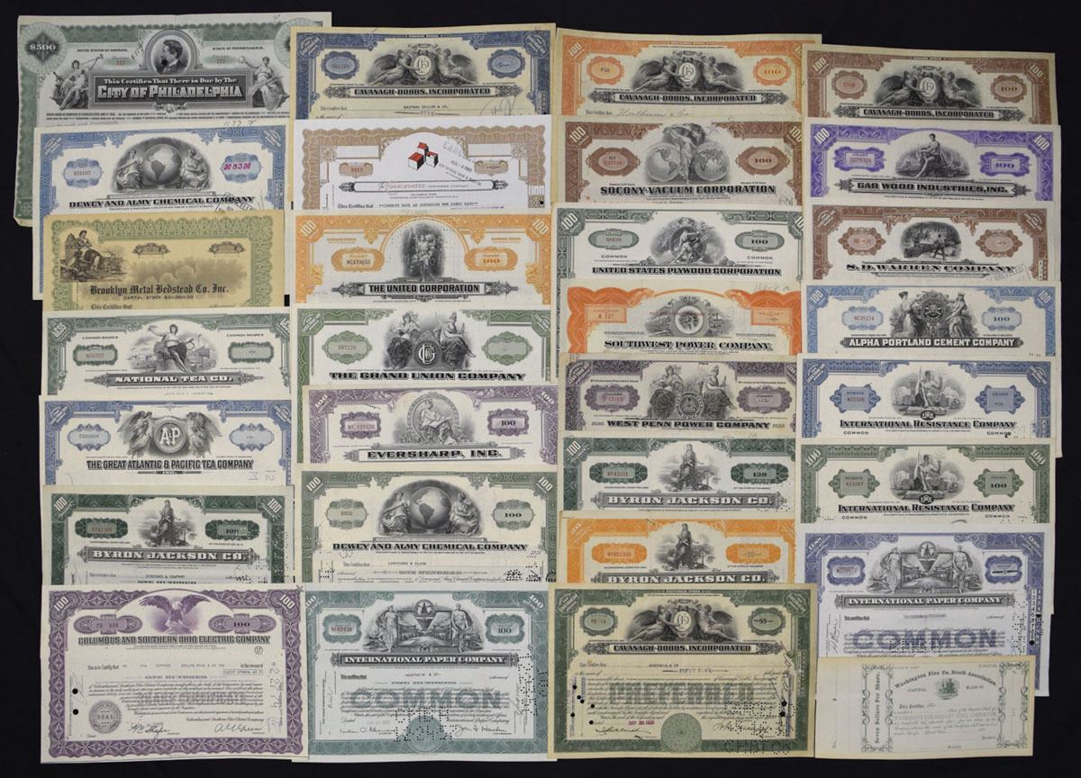 Various States, 1896-1967. Lot of 30 I/C Stock Certificates, Includes: Alpha Portland Cement Co; Brooklyn Metal Stedfast Co Inc; Byron Jackson Co (multiple); Cavanagh-Dobbs Inc (multiple); City of Philadelphia; Columbus & Southern Ohio Electric Co; Dewey & Almy Chemical Co (multiple); Eversharp Inc; Gar Wood Industries Inc; The Grand Union Co; The Great Atlantic & Pacific Tea Co; International Resistance Co (multiple); National Tea Co; S.D. Warren Co; Socony-Vacuum Corp (multiple); Southwest Power Co; United States Plywood Corp; The United Corporation; West Penn Power Co. A visually diverse group spanning power utilities, retail chains, chemical manufacturers, consumer goods, cement and industrial suppliers, and municipal finance, displaying bold border colors, classic vignette engravings, and mid-20th century corporate artwork. Conditions range from Good to VF overall with typical folds, punch and stamp cancellations, and handling wear. (30). Sold “AS IS” no returns accepted.