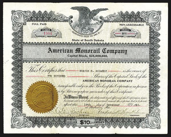 Baltimore, MD (Inc. in SD), 200 Shares, I/U, Eagle on top, VF-XF, Operated in the Bronx, New York, it was used on the Pelham Park and Island City Railroad, a disastrous accident in June 1910 led to the line going out of business. This certificate was issued shortly after.