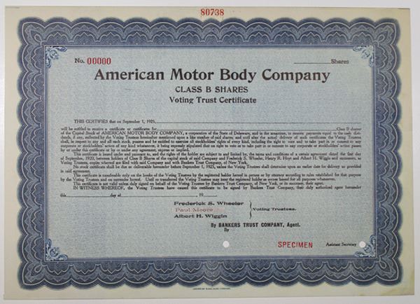 Delaware, 1920's. Odd Shares Specimen Class B Voting Trust Capital Stock Certificate, Black text with blue border and background. Red specimen overprint, 00000 serial number, POCs. VF condition, ABNC. American Motor Body was purchased in 1925 by the Chrysler Corporation.