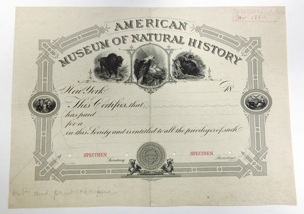 New York, NY, 18xx (Jan. 1883, Specimen membership certificate, Black printing without underprint, Title on top over vignette of buffalo, eagle feeding young in nest and beaver at right, U.S. & N.Y arms on left and right, seal at bottom, POC's, Specimen overprints, and purple archival handstamp on upper right, vertical fold has some separation on top and bottom borders archivally reinforced, extremely attractive certificate that should attract attention of Zoo collectors and natural history collectors. VF condition, ABNC.