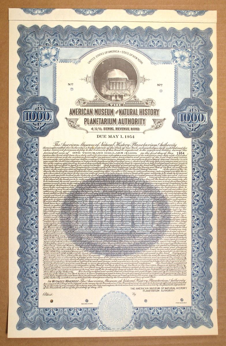 New York, 1934. $1000 Specimen 4.5% Serial Revenue Coupon Bond, Black text with blue border and underprint, Hayden Planetarium depicted at top center. POCs throughout, VF condition, HBN. The original Hayden Planetarium was founded in 1933 with a donation by philanthropist Charles Hayden. The Hayden Planetarium, designed by architects Trowbridge & Livingston, opened In 1935. In January 1997, the original Hayden Planetarium was closed and demolished. On February 19, 2000, the $210 million Frederick Phineas and Sandra Priest Rose Center for Earth and Space, containing the new Hayden Planetarium, opened to the public. Neil deGrasse Tyson is its first and, to date, only director. This bond was issued in the 4th year of the Authority's existence. This is the second of only 2 examples found of this variety in the ABN Archives.