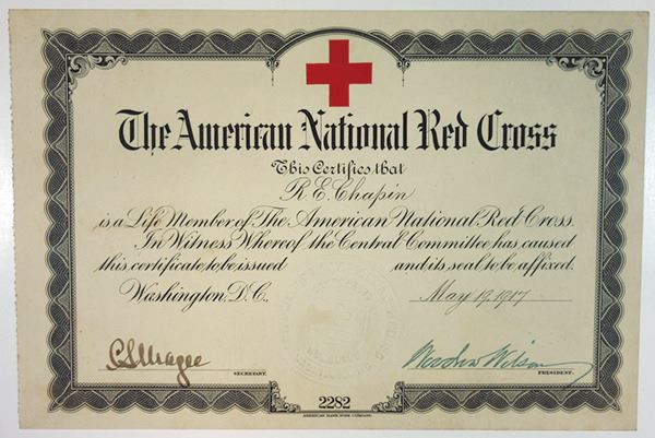 Washington D.C., May 19, 1917, Issued Red Cross Life Member Certificate, Black border with well known Red Cross at top middle, S/N 2282, Certificate stating R.E. Chapin is a life member of the American Red Cross. Certificate is in VF-XF condition with minor toning over right portion of certificate, ABNC. Signed by President Woodrow Wilson as president.