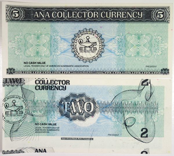 Germany. Lot includes 2 pieces of intaglio printed ANA Collector Currency: One is a incorrectly cut note with 2 on the front, 5 on the back, both in blue and green; Second piece is a 5 note with association logo at center, in blue and green. 2 pieces. No cash value, was legal tender only at the American Numismatic Association. Printed by ABNC. (2)