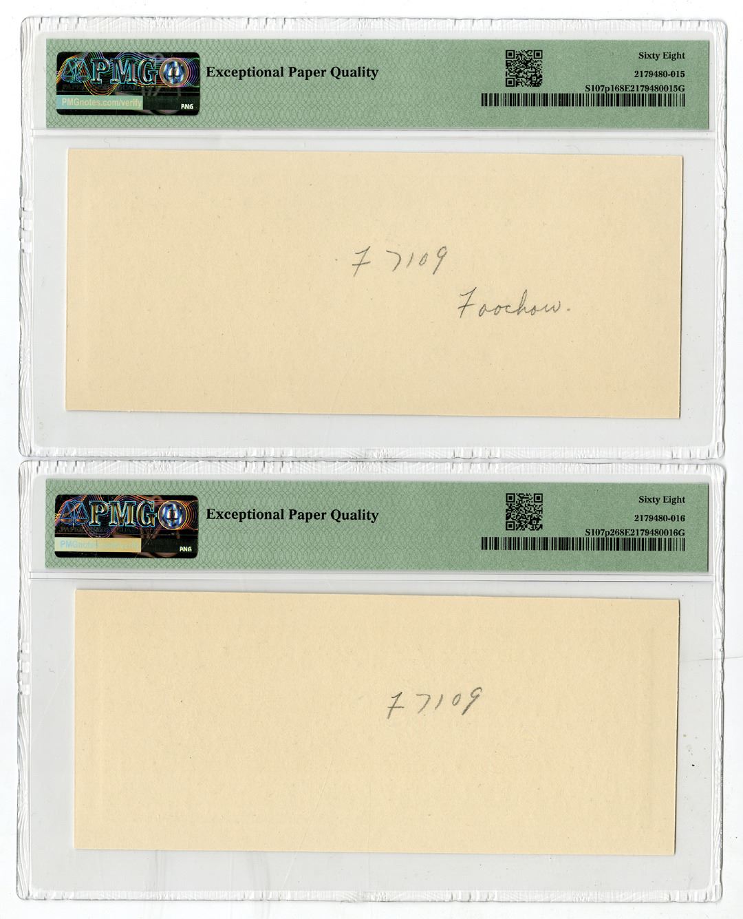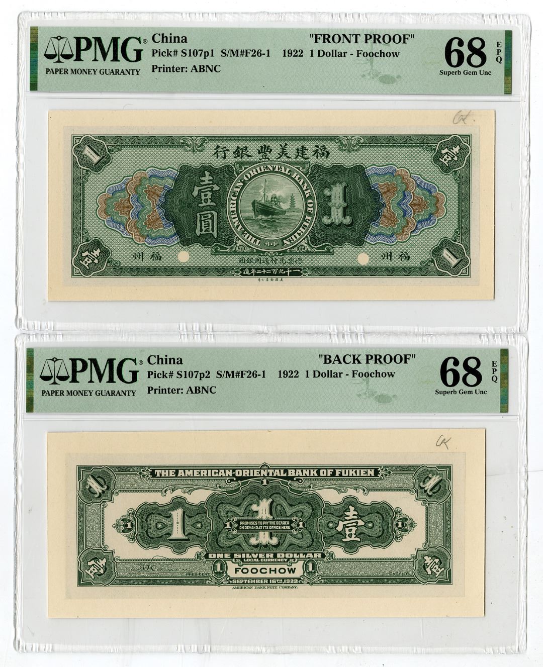 Foochow, China. $1, P-S107p1 and P-S107p2, Front and Back Proof banknotes, the Front Proof is Green on m/c with steamship sailing with Pagoda in background, back is green with ornate cycloid engravings, both printed on india paper mounted on cut down thin card, both the Front and back Proofs are PMG graded Superb Gem Uncirculated 68 EPQ. Highest graded banknote out of 3 notes that have been graded in the PMG census since they were first discovered in the 1991 Christie's American Bank Note Archives Auction. This note has never been offered for sale since 1991 when it first appeared at Christie's.