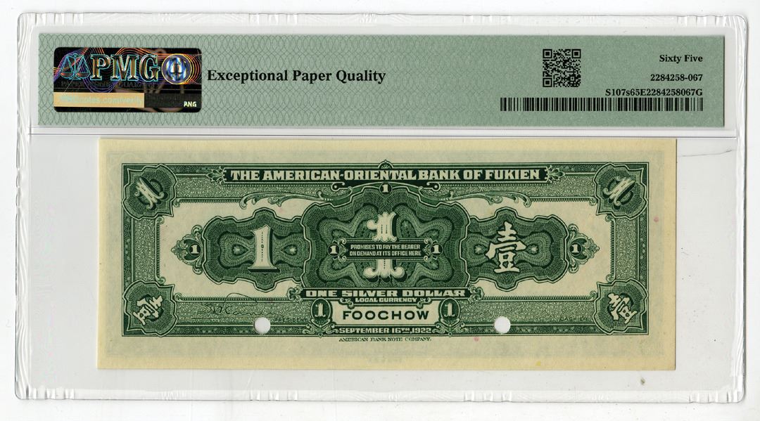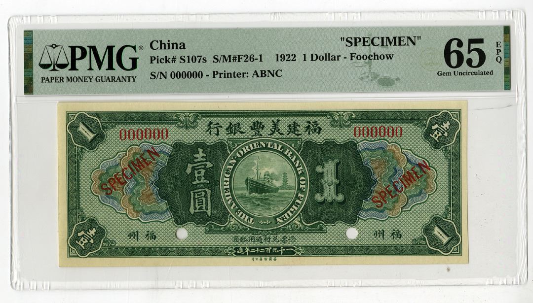 Foochow, China, 1922. 1 Silver Dollar, P-S107s S/M #F26-1, Specimen Banknote. Foochow Branch, Green on m/c with steamship vignette, Back green, Red Specimen overprint, “00000” serial numbers and POC's, PMG graded Gem Uncirculated 65 EPQ, ABNC.