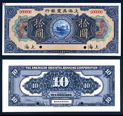 Shanghai, China. 1919. $10. P-S98s. (S/M #S53-0.3). Specimen banknote. Blue on light brown with steamship vignette. Red specimen overprint, “00000” serial numbers and POC's. PMG graded Gem Uncirculated 66 EPQ (Exceptional Paper Quality)”. Very attractive and rare note only available as specimen or proof. One of 3 notes graded at this level by PMG and none graded higher. ABNC. Rare banknote.