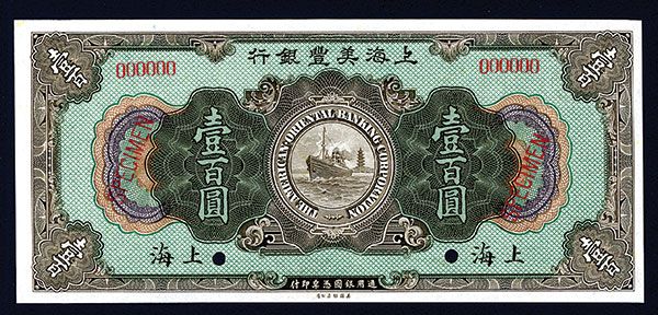 Shanghai, China. 1919. $100. P-S100s. (S/M #S53-0.5). Specimen banknote. Dark brown on green and m/c with steamship vignette, back brown. Red specimen overprint, “000000” serial numbers and POC's. Choice Uncirculated. Very attractive and rare note only available as specimen or proof. ABNC.