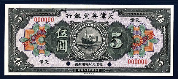 Tientsin, China. 1924. $5. P-S105s. (S/M #S127-). Specimen banknote. Black on light purple and m/c underprint with steamship vignette, back orange. Red specimen overprint, “00000” serial numbers and POC's. PMG graded Gem Uncirculated 66 EPQ, ABNC. There is a total of 9 graded in the PMG census, this note tied with 3 others for highest grade.
