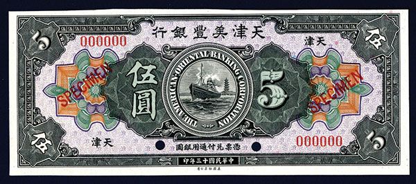 Tientsin, China. 1924. $5. P-S105s. (S/M #S127-). Specimen banknote. Black on light purple and m/c underprint with steamship vignette, back orange. Red specimen overprint, "00000" serial numbers and POC's. Choice AU to Uncirculated with a light fold in the lower left corner due to archival handling. Rare banknote in any condition. ABNC.