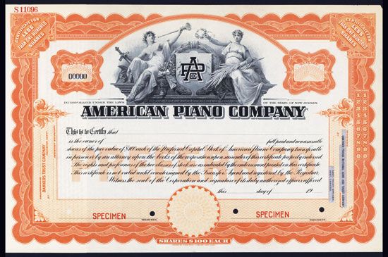 New Jersey, 19xx, <100 Shares, Specimen Stock, Black on orange border and underprint, Company logo top center flanked by two sitting allegorical women, Red SPECIMEN overprints POC's and blue s/n Ò00000Ó, VF-XF condition, ABNC.
