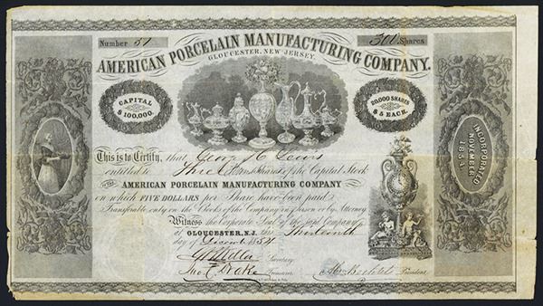 New Jersey, 1854, 300 Shares, Issued Stock, Black on black border with no underprint, Display of porcelain pieces top center with maid delivering tea mid left and ornate porcelain clock on right, VF-XF condition. S/N 51, Unique certificate for an amazing porcelain manufacturing company.