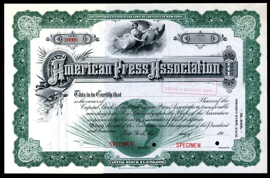New York, 191x, Odd Shares, Specimen stock certificate, green border and underprint of world globe in middle with allegorical woman and patriotic eagle on top over ornate title. Specimen overprints, PPOC's, Extremely attractive stock certificate. ABNC.