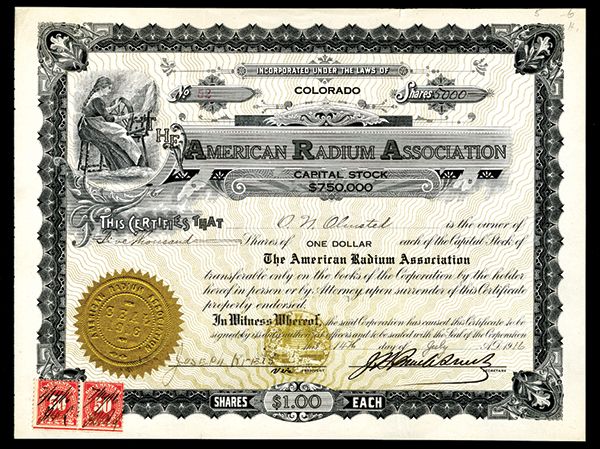 American Radium Association, 1916 Stock Certificate. Colorado, 5000 Shares, I/U, Woman w. Spindle UL, scarce subject matter.