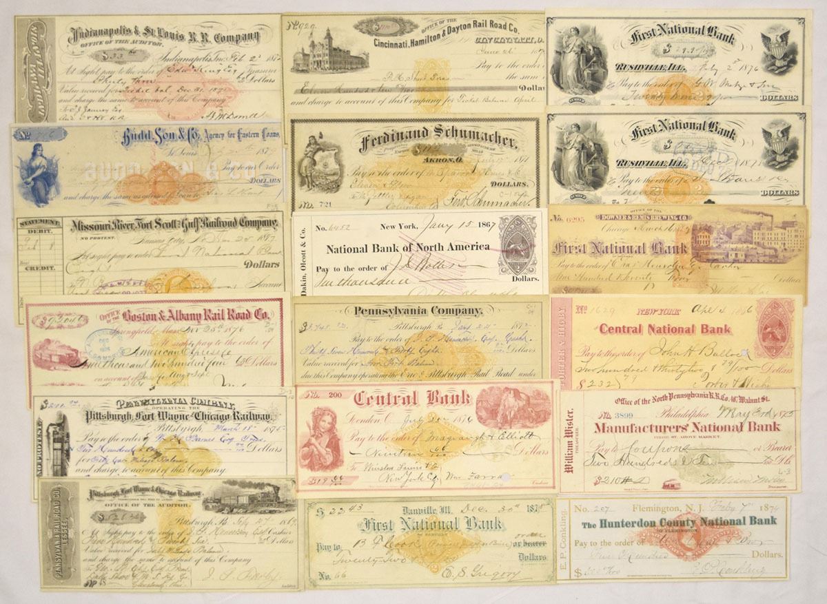 Various States, 1866-79. Lot of 17 Issued railroad and bank checks representing early American transportation and banking history, Includes: Indianapolis & St. Louis R.R. Co.; Cincinnati, Hamilton & Dayton Rail Road Co.; Missouri River, Fort Scott & Gulf Railroad Co.; Boston & Albany Rail Road Co.; Pennsylvania Co.; Pittsburgh, Fort Wayne & Chicago Railway; Central Bank; National Bank of North America; Central National Bank; Manufacturers National Bank; Hunterdon County National Bank; First National Bank of Rushville, Ill.; First National Bank of Danville, Ill., among others. Designs feature locomotives, allegorical figures, eagles, industrial and city scenes, and revenue stamps, Condition ranges from Fine to Very Fine overall. (17). Sold "AS IS" no returns accepted.