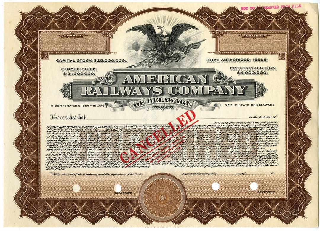 Delaware. Odd Shares Preferred Stock Specimen Certificate, Black print on large brown border and under tint, Image of Bald Eagle at top, Cancelled overprints and POC's, VF-XF condition, SBNC.