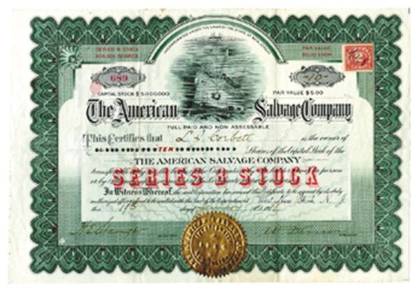 New Jersey. 10 Shares, I/U, Black on green border and underprint, amazing vignette of sunken ship with diving bell next to it, Fine condition with a small stain on the top right and a few small rust spots, gold foil seal bottom middle, S/N 689, Scarce and popular stock certificate.