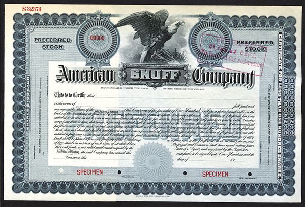 New Jersey. Odd Shares Preferred Stock Specimen Certificate. Black print with a blue/grey border and under tint. Vignette of an American Bald Eagle at top center of certificate. Specimen overprints, POC's, VF Condition. This company traces its origin to a small snuff mill established just after the Revolutionary War. Great tobacco related item.