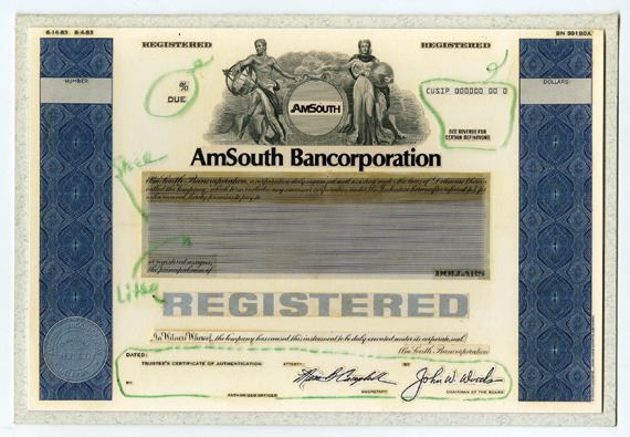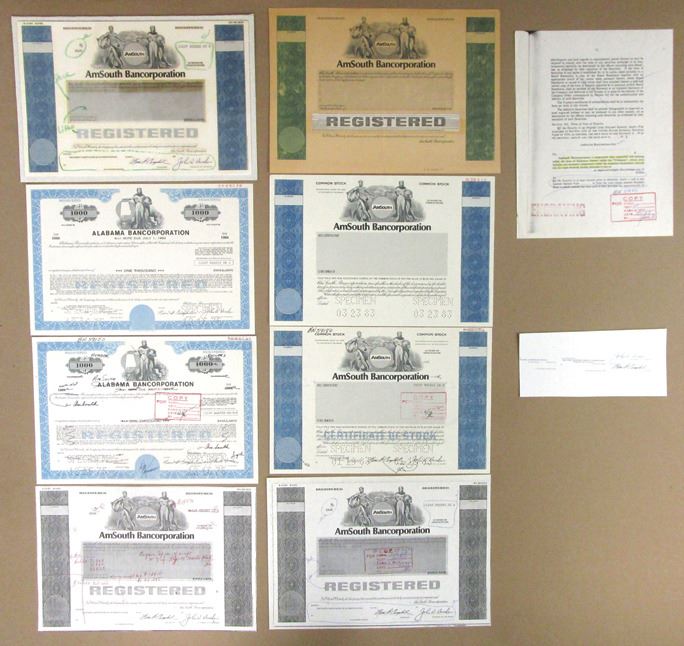 Security-Columbian Banknote Co., Includes production department files and records from American South Bancorporation featuring a unique registered bond mockup or prototype of different design elements, text and vignettes pasted to a thin card protected by a clear plastic covering, Also includes 4 specimens and 1 proof Registered Bond as well as correspondence with production department notes and changes. Sold "AS IS" no returns accepted. (10 items). AmSouth Bancorporation was a banking company headquartered in Birmingham, Alabama, and operated for its final year in existence as a bank holding company (subsidiary) of Regions Financial Corporation after a merger between the two banks. AmSouth was previously known as First National Bank of Birmingham, which was first organized by Charles Linn in 1872. AmSouth was in the financial services industry and at its peak employed over twelve thousand people.
