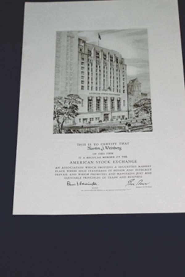 New York, 1972-1976, Membership certificate for Martin J. Weinberg to the American Stock Exchange, Sketch of the American Stock Exchange building on Greenwich St. top portion of certificate, VF condition. Facsimile signatures of the exchange president and chairman bottom right.