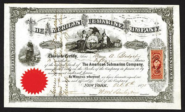 New York, 50 Shares, I/Cm New York arms center, Sailing ship on left, Red seal and U.S.I.R. Stamp on right, VF.