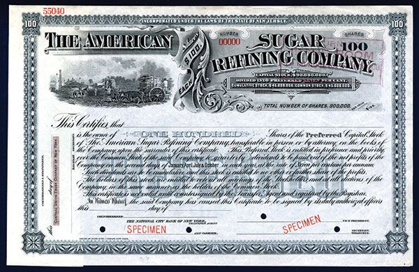 New Jersey. ND. 100 Shares Specimen Stock. Black on green border and underprint. Sugar cane plantation vignette top left corner. POC's and red SPECIMEN overprints. VF condition. ABNC.