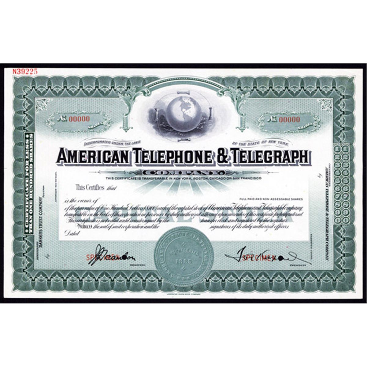 New York, ND (ca. 1890-1910), Odd Shs, Black on green border and underprint, Globe with telephones and wires circling the globe, Specimen overprints, POC's, XF condition. ABNC.