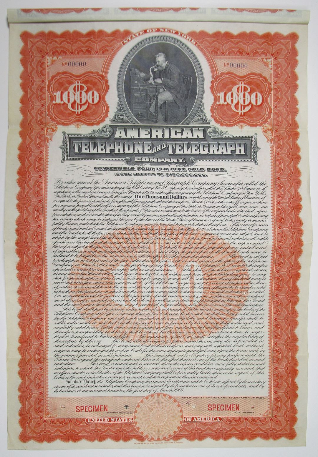 New York. $1,000 Specimen 4% Convertible Gold Coupon Bond, Black printing on orange border and underprint, Image of Alexander Graham Bell at top, Specimen overprints and POC's, VF-XF condition, ABNC. Rare and early AT&T bond.