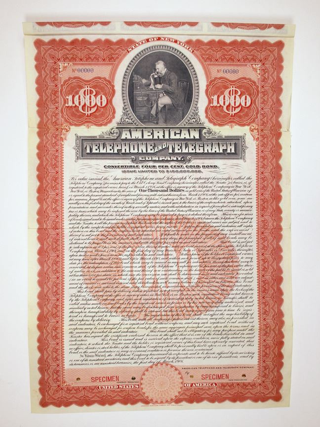 New York. $1,000 Specimen 4% Convertible Gold Coupon Bond, Black printing on orange border and underprint, Image of Alexander Graham Bell at top, Specimen overprints and POC's, VF-XF condition with a small nick out of the right side margin top fold, ABNC. Rare and early AT&T bond.