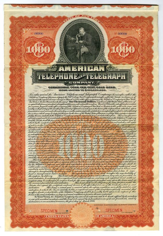 New York, 1906. $1000 Specimen 4% Convertible Gold Coupon Bond, Black on orange border and underprint, Image of Alexander Graham Bell at top speaking on an early telephone, Specimen overprints and POC's, VF to XF condition with a small nick out of the right side margin top fold, ABNC. Rare and early AT&T bond.