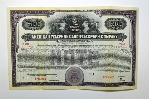 NY. $500, Specimen 5 Year 6% Gold Coupon Bond or note, Black on purple with seated allegorical woman flanking AT&T logo on top, VF, ABNC. Rare early AT&T Bond.